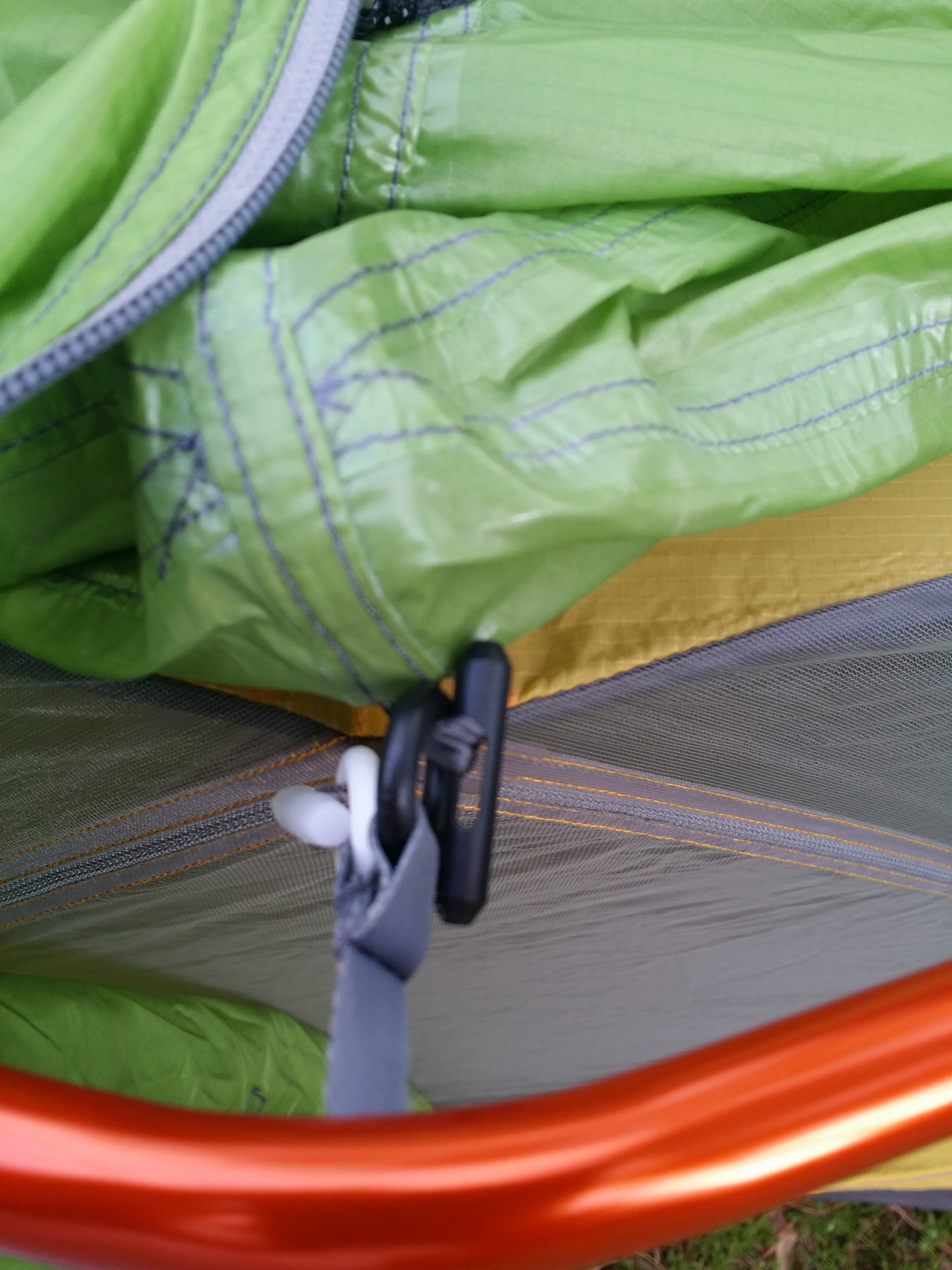 I unclipped the two corners of the rainfly on the of the door where the Outer Space will go. Then pulled back the rainfly and attached the four clips and the rubbery strap as shown.