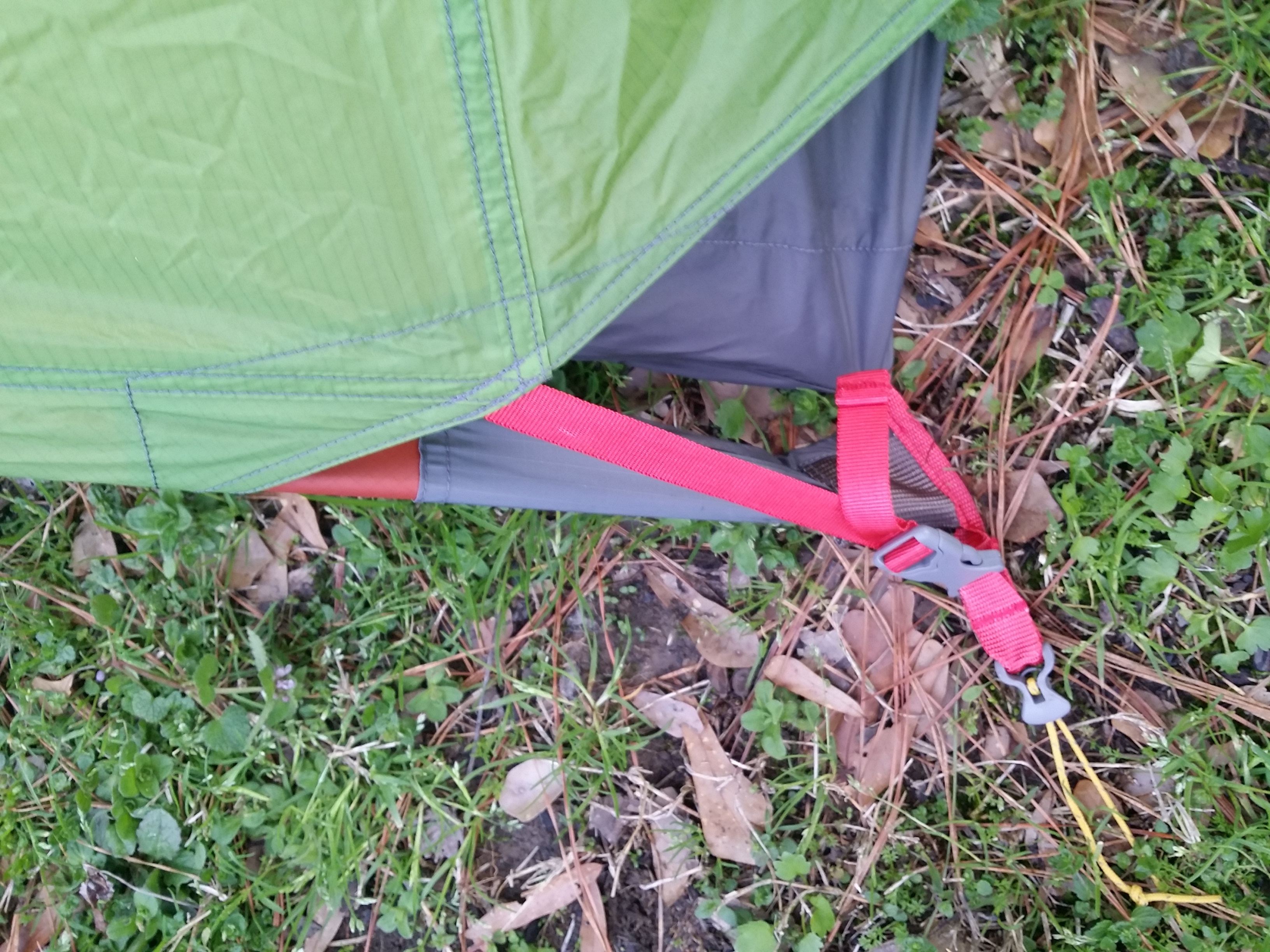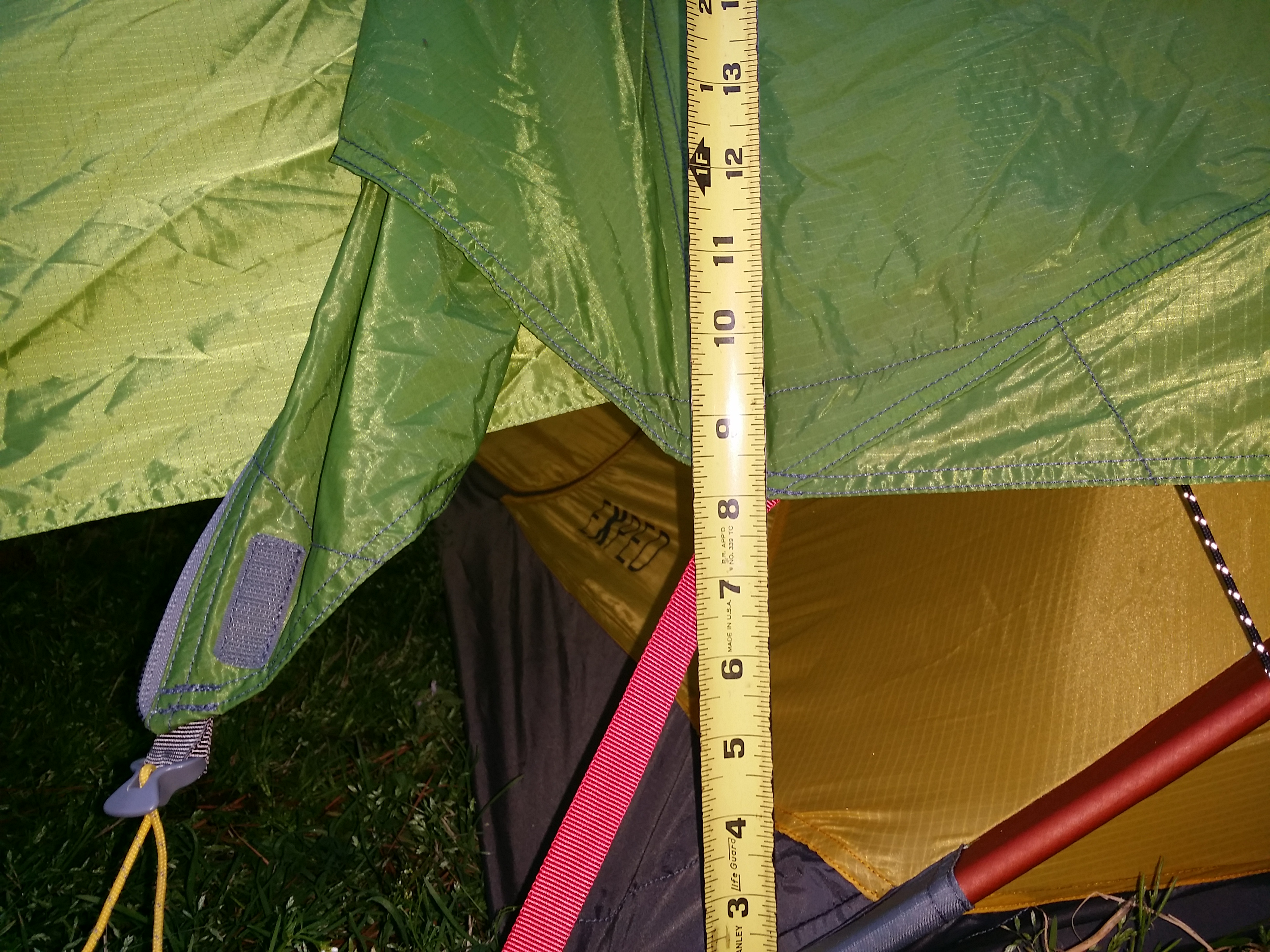 The vent on the fly is a little bunched, so I did some fixing. You can also see there is a rather large gap at the bottom, where the fly and Outer Space connect. I had to cinch that down a bit, or rain would simply bounce up and wet out the inner tent in a hurry.