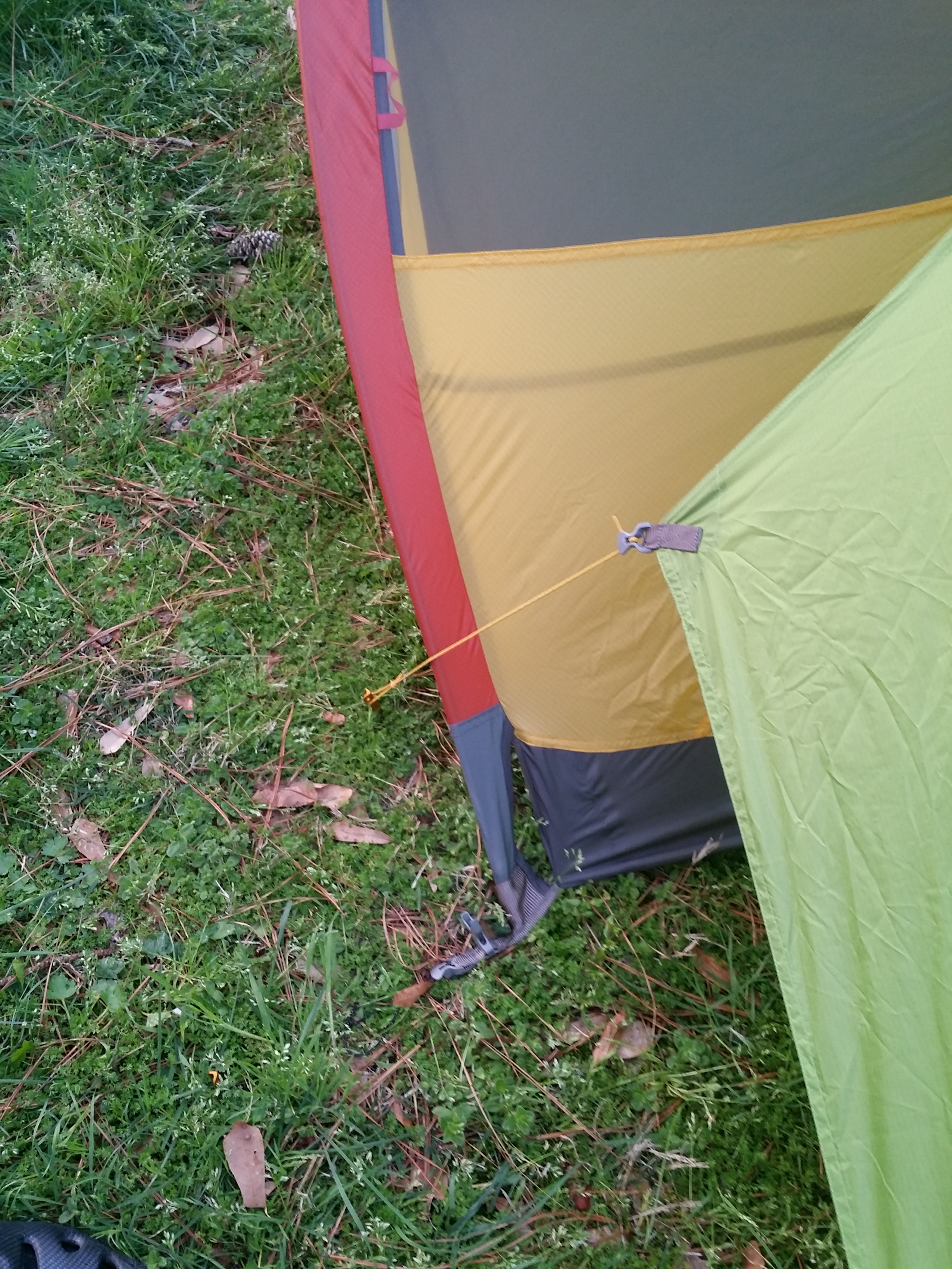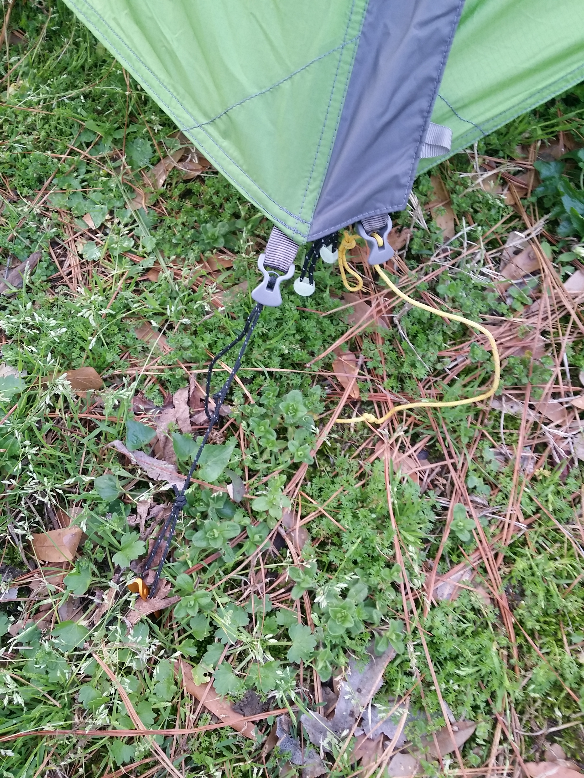 So now it’s time to stake the rainfly back out. I used the cord attached to each side of the door on the tent, plus re-attached the clips mating the tent and rainfly. There is just a bit more sag now, and I didn’t really fasten anything down too tight. Just enough to make it secure.