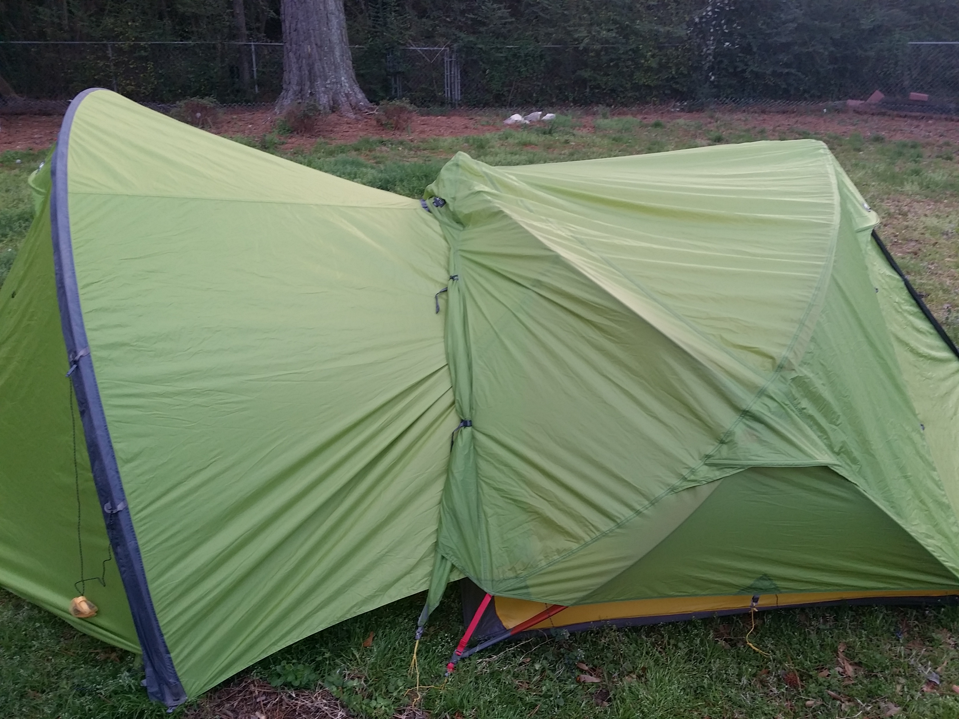 So how am I looking? I have not rain or hose tested this setup yet. There is some sag to the Gemini, but I don’t see any way to avoid that. The basic design of the Gemini means it has a lot of flex. If you just put your hand on it it takes only a little pressure to bounce the poles. I could loosen the four clips that attach the Outer Space to the tent poles, but I think I need the fabric to be pretty high up in order to create the gutter. I can do some testing on that.